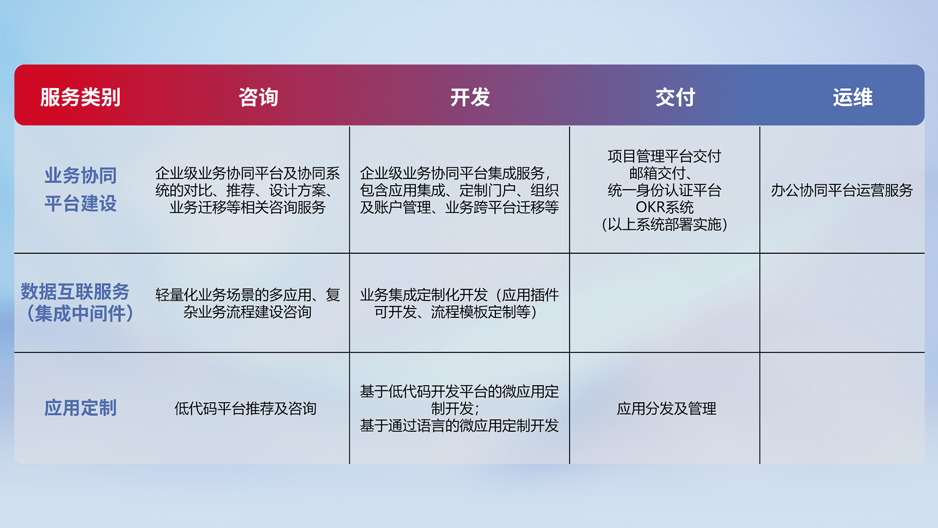 针对钉钉、、、企微、、IDaas等平台级产品提供产品的规划、、、方案、、交付、、定制化开发等服务,,,,实现如统一协同办公、、、、智能客户服务、、、、混合会议管理、、智能数据查询、、、、等业务场景,,,,实现数字化转型。。
