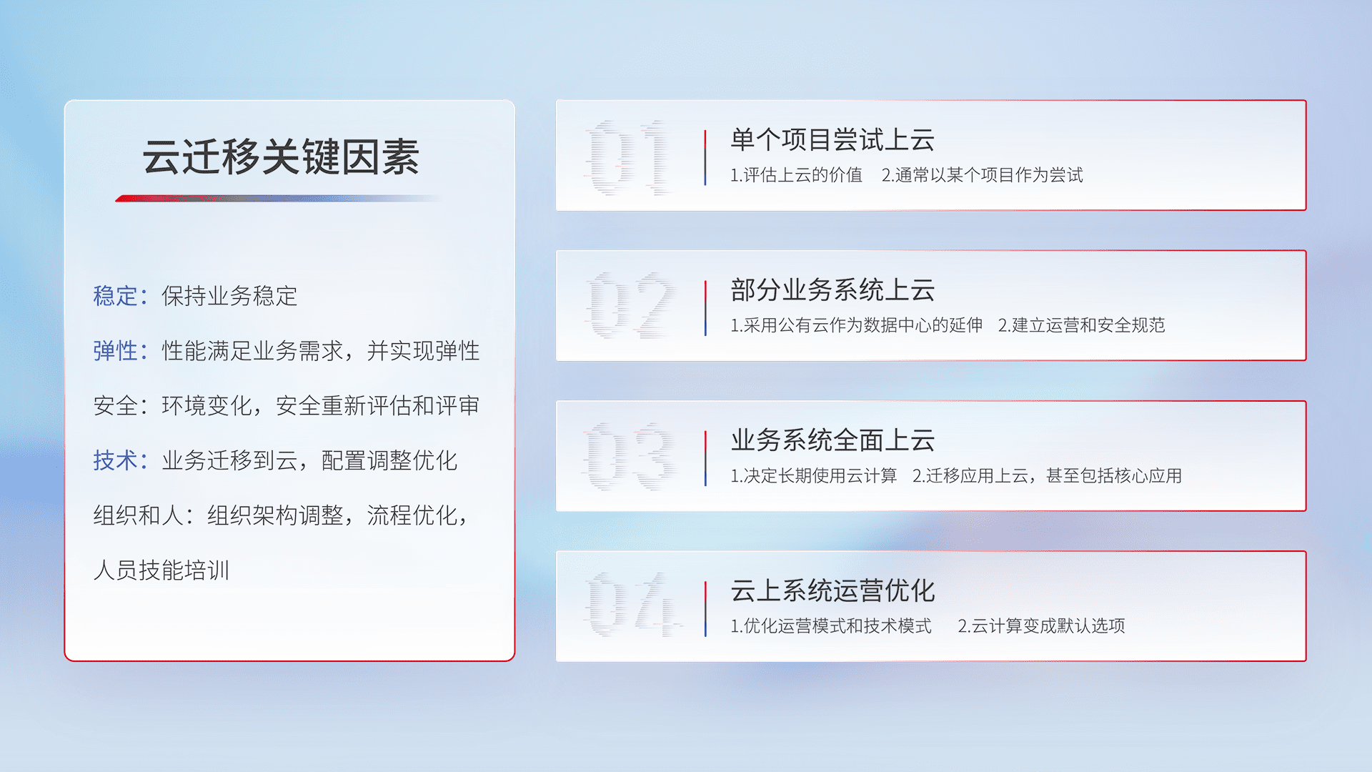 结合实际业务,,从规划设计、、云平台选型、、云原生改造、、数据迁移、、、、集成交付,,迁移全过程为客户识别最佳上云路径,,,做好风险识别管理,,,设计网络架构、、、身份权限、、、、安全审计合规、、、、操作审计、、日志审计、、、监控告警策略、、、多站点容灾设计等,,对云上基础设施进行整体规划,,提升IT治理水平,,,以满足弹性、、高可用、、高性能的需求。。。。