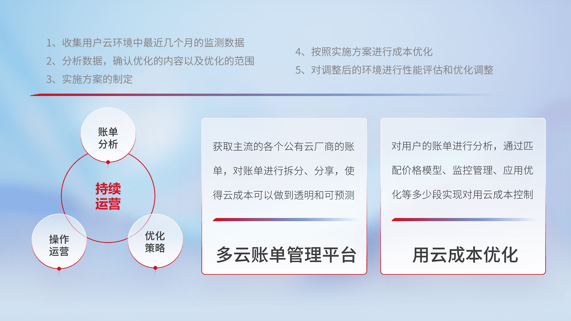 通过多云纳管,,,,以统一的资源数据模型把客户的云资源进行抽象和封装,,,,进而实现对多云资源的统一操作,,,,保障云资源管理的可靠性、、、、稳定性与可用性。。。量身定制化运维内容,,配置、、、、开发运维、、、补丁管理、、、备份、、监控、、认证和访问管理、、、、审计和日常巡检等,,,保障在用云过程中的可靠度,,稳定度以及高可用率。。。